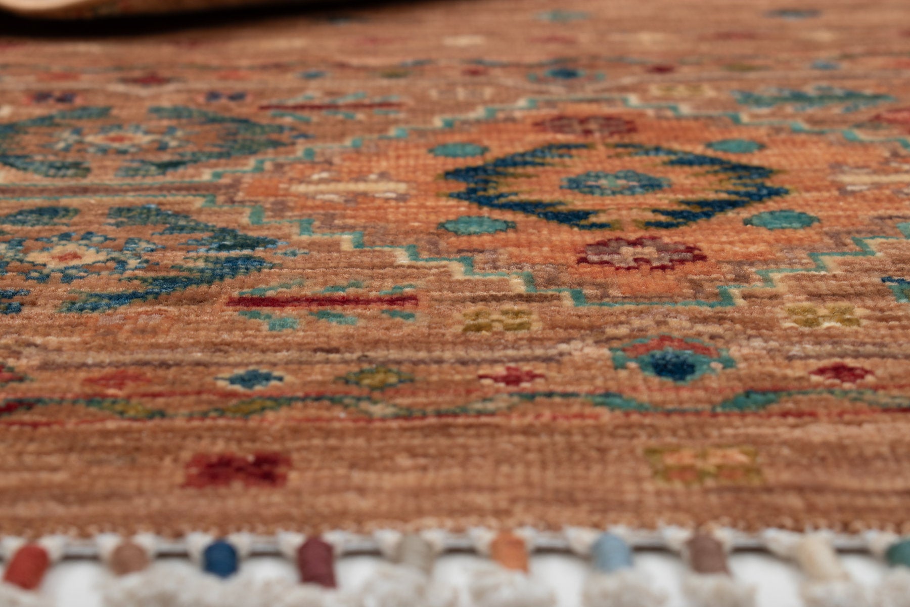 Heute stehen Samarkand-Teppiche für außergewöhnliche Qualität und moderne, orientalisch angehauchte Muster. Die Teppiche beziehen ihre Inspiration aus dem klassischen Perserteppich-Design. Die verwendete Wolle ist von hoher Qualität und die aus natürlichen Pflanzenfarben bestehende Farbpalette ist weicher und subtiler als die von Perserteppichen. Der kürzere Flor macht es einfach, den Teppich sauber zu halten.