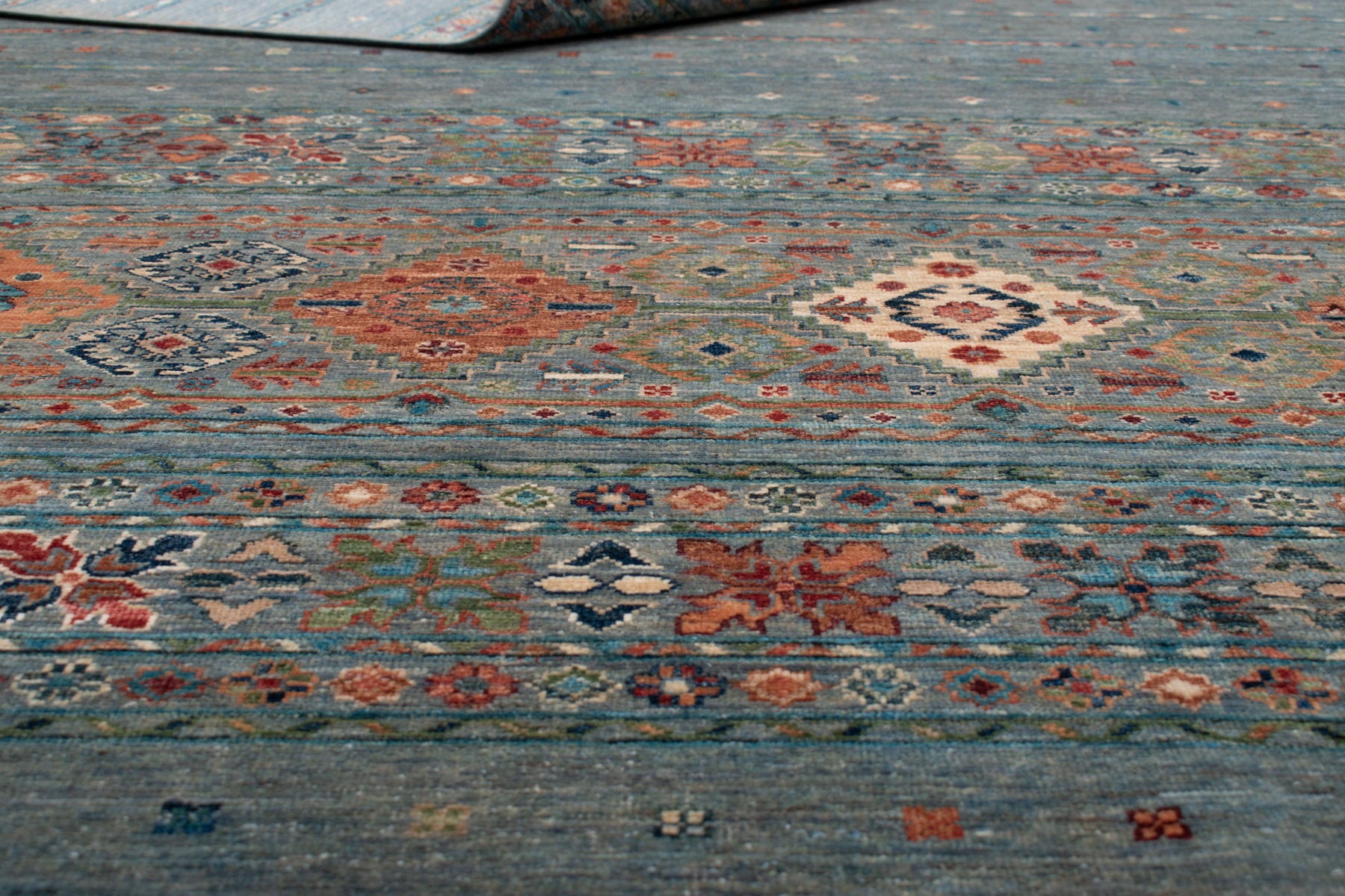 Heute stehen Samarkand-Teppiche für außergewöhnliche Qualität und moderne, orientalisch angehauchte Muster. Die Teppiche beziehen ihre Inspiration aus dem klassischen Perserteppich-Design. Die verwendete Wolle ist von hoher Qualität und die aus natürlichen Pflanzenfarben bestehende Farbpalette ist weicher und subtiler als die von Perserteppichen. Der kürzere Flor macht es einfach, den Teppich sauber zu halten.